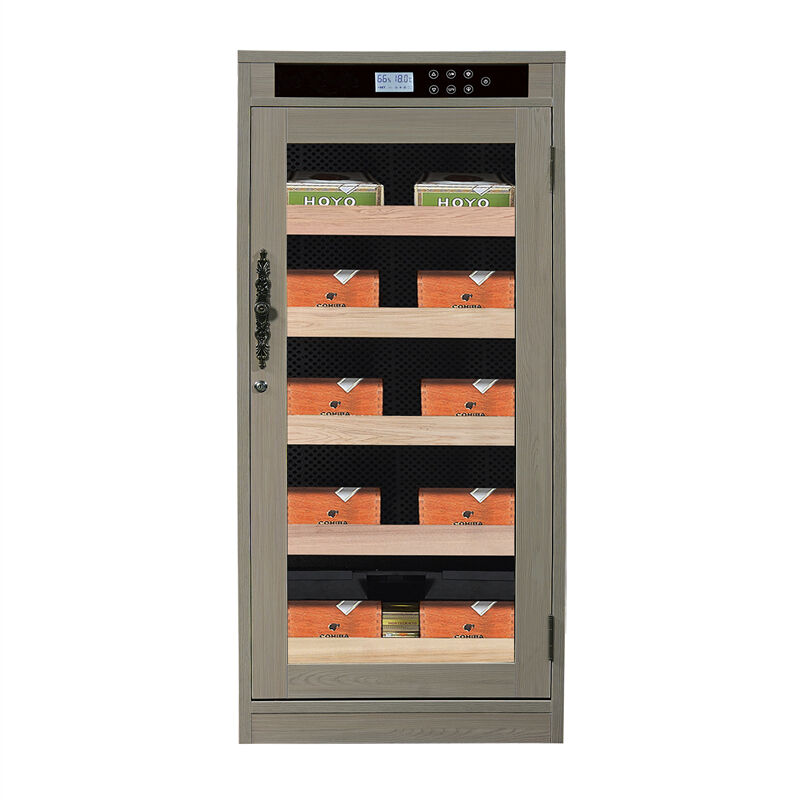 Featuring a refined gray wood finish that exudes luxury and sophistication, this Cigar Cooler Humidor cabinet combines modern aesthetics with timeless appeal. The sleek design includes a transparent glass door that elegantly displays your premium cigar collection while maintaining optimal storage conditions. The elegant digital control panel at the top provides real-time monitoring of humidity and temperature levels, ensuring precise environmental control for your cigars.