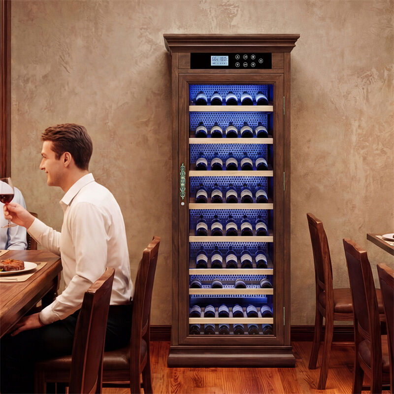 Meet the ultimate solution for all your wine storage needs: our premium wood wine cooler cabinet, the perfect wine refrigerator for homes, restaurants, and wine bars. This freestanding unit combines the timeless beauty of solid wood construction with professional compressor cooling, delivering unbeatable performance and style for every wine enthusiast.
